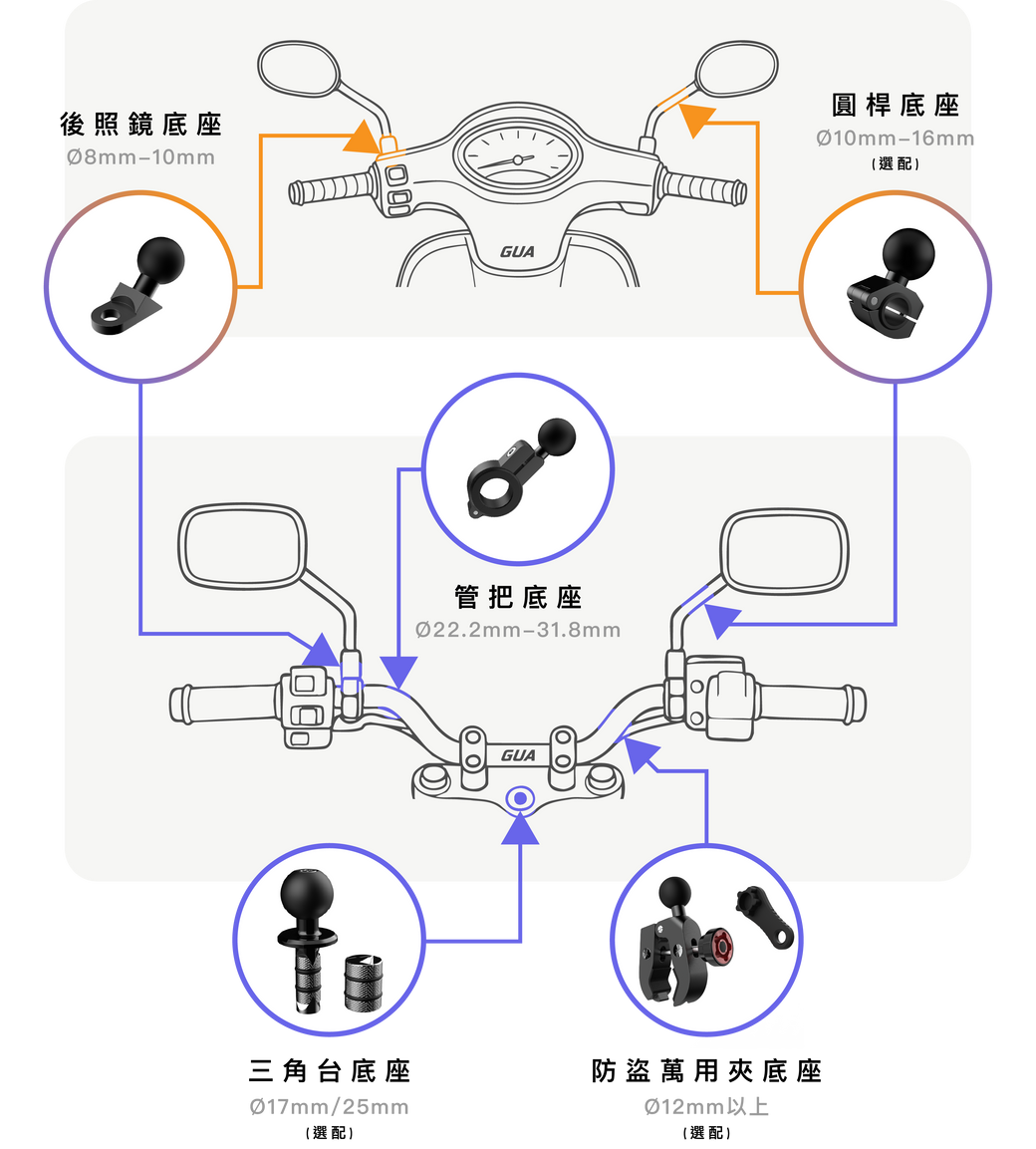 Whether you prefer mounting your phone on the handlebars, handlebar clamp, mirror stem, or fork stem, the GUA Motorcycle Kit offers secure and convenient solutions designed for real-world riding.